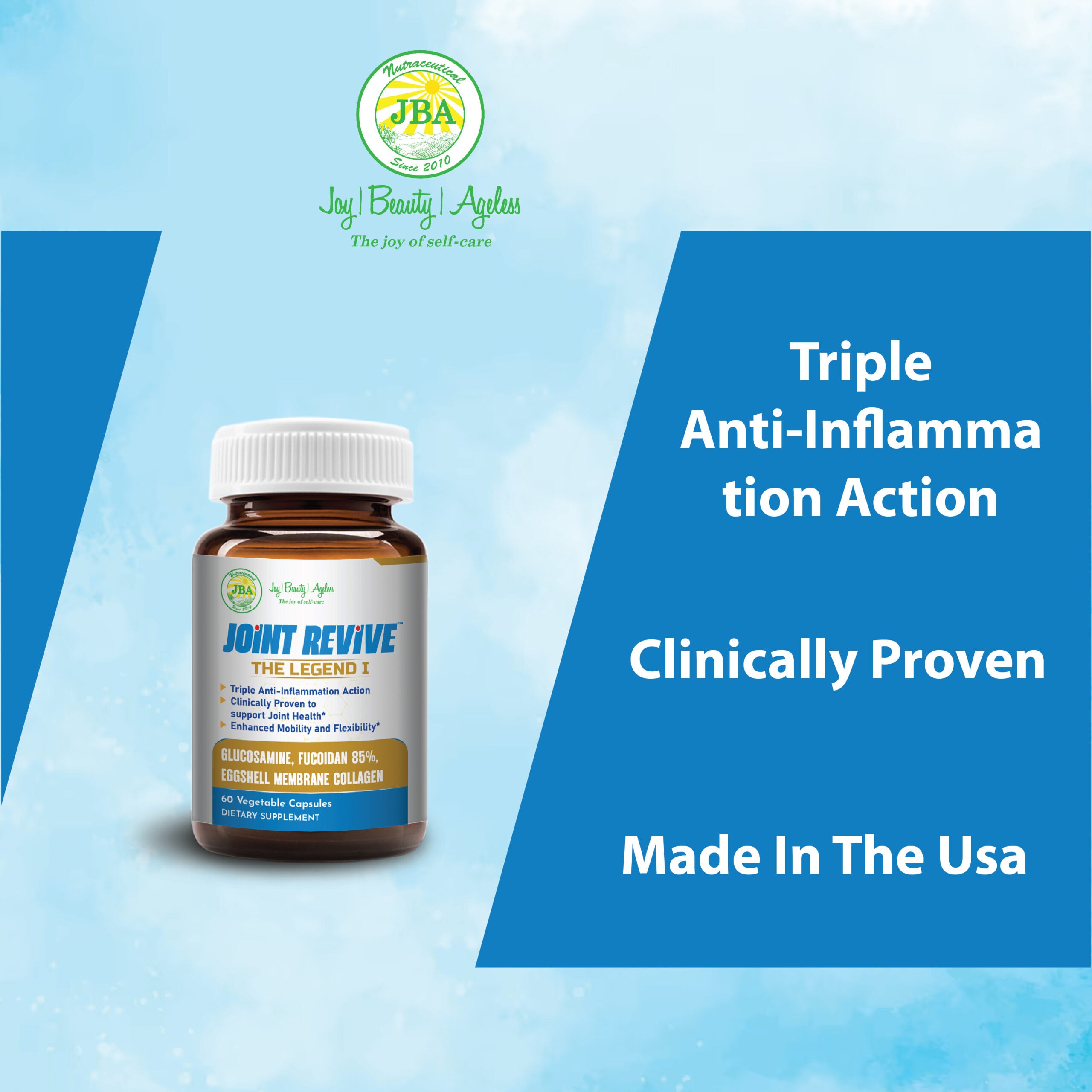 Proudly Made in the USA, Joint Revive ensures high-quality standards and premium ingredients. Try it today and feel the difference. * These statements have not been evaluated by the Food and Drug Administration. These products are not intended to diagnose, treat, cure, or prevent any disease.