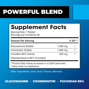 Glucosamine Sulfate, Chondroitin Sulfate, Axit Citric, Fucoidan 85%, Axit Citric, Hương liệu, Mannitol.